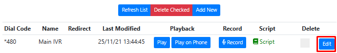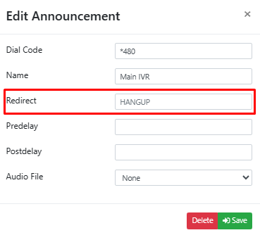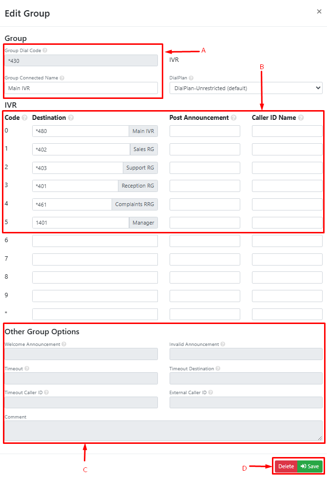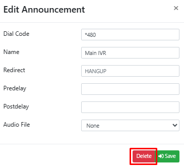 Delete: This button allows you to remove the current IVR configuration. Use this with caution as it will permanently delete the selected IVR and all of its configurations.