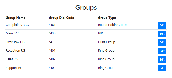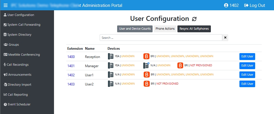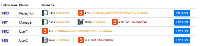 This section lists the desk phones and softphones associated with each extension, and the connectivity status of each device. When a call is made to a specific extension/user, how associated devices ring is defined in the User configuration (click the relevant Edit User button).