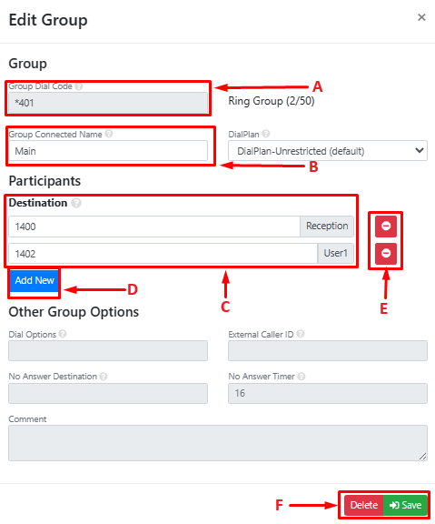 Call Pickup Group | Manually add or select existing groups for call pickup membership. This relates to using the GPickup softkey on a deskphone to answer calls ringing on other phones that are part of the same Call Pickup Group. |