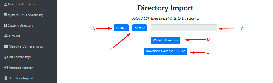 Clicking this button will download a file that provides you with an example of the layout of the CSV file that is required to be uploaded to correctly add directory contacts.