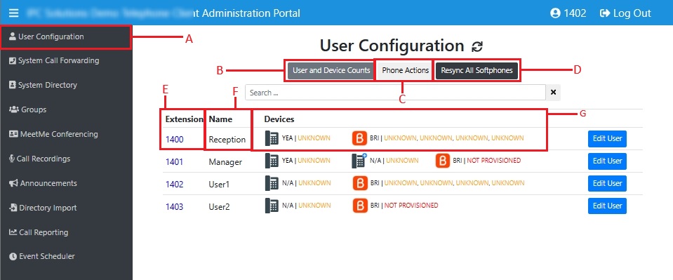 The User Configuration page provides a comprehensive overview of all users within the system who possess either a physical phone, a softphone, or both.