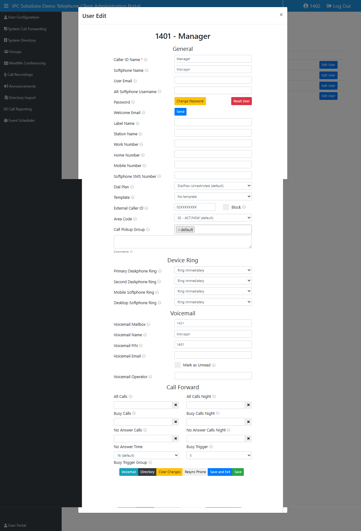 Caller ID Name | This is the name displayed when you make calls and is listed in the system directory. Click "Resync Phone" if you change this. |