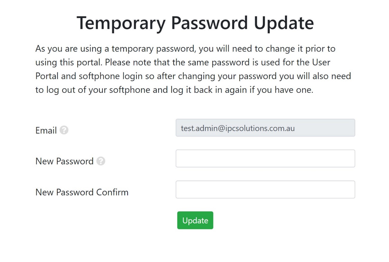 Upon your first time logging into the portal, it may ask you to change your password from the temporary one we provided to your own password. Please note that this login will be the same for your user portal and softphone, so if you change the password for one of these systems, you will need to log back into the other systems with your new password.