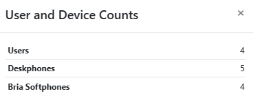 By clicking this button you will be able to see the number of Active Users, Number of Desk phones provisioned and Number of Bria Softphone Licenses Provisioned. Note this is not the actual count of users that are currently registered or online, but rather shows the number of licenses you have.