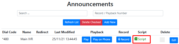 Enter the number of the phone that you wish to use to record the announcement in the Record / Playback text box. Click on the Script icon next to the announcement and select Record . The Record / Playback number you entered above should ring and you can record the message. The script is shown to read from. To give the best recording quality, use the handset rather than a headset.